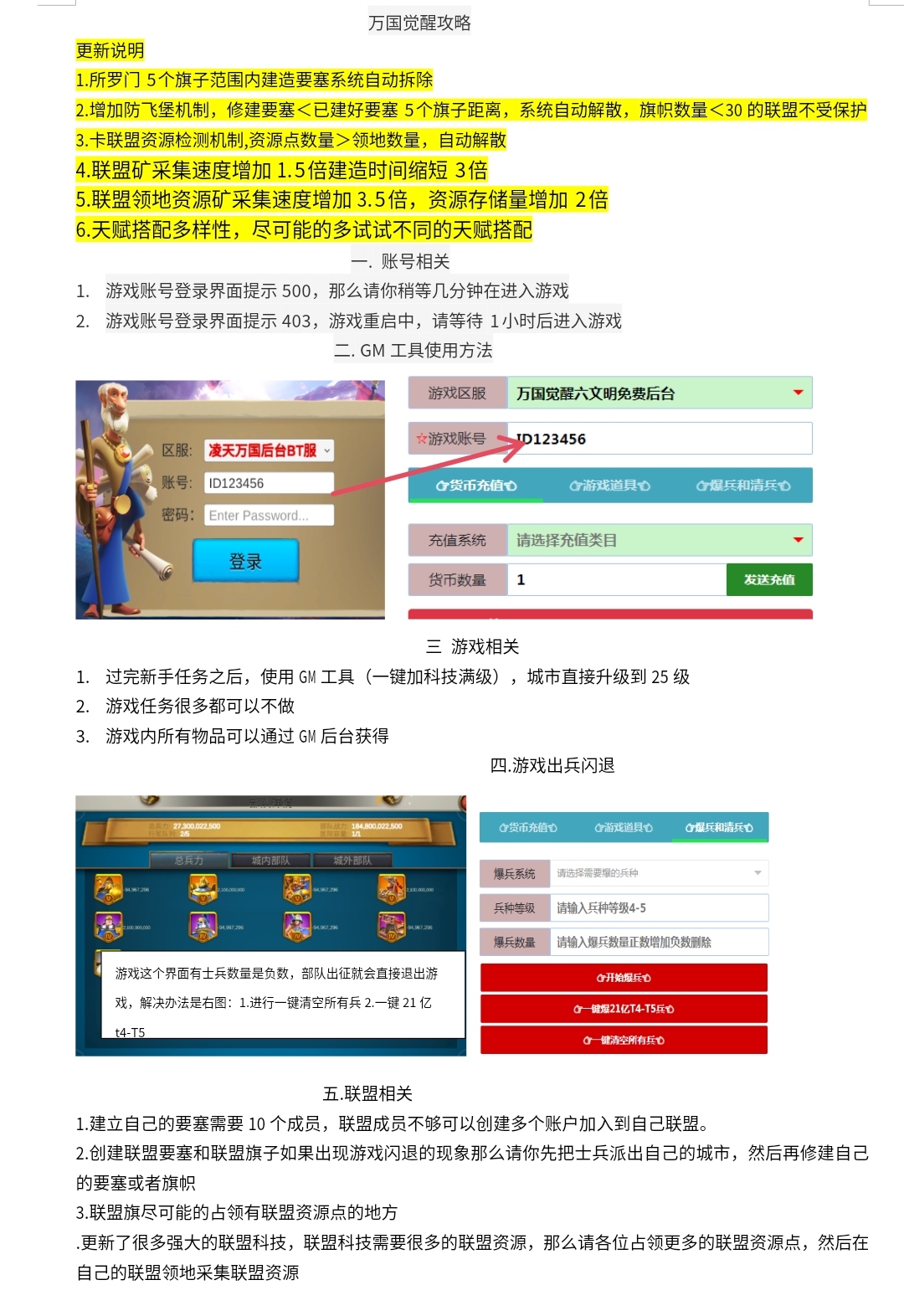 警告:游戏中禁止使用违禁词,敏感词.文明游戏人人有责!游戏版本已更新至3.0.4版本,网页下方下载最新版本,游戏新增10倍伤害,使用道具:24小时进攻强化,获得10倍伤害加成.建造要塞和旗子请把队伍派出主城后再进入旗子或者要塞,可以避免游戏闪退;如果出兵出现游戏闪退,请点击自己头像,点击部队,部队数量是负数就会出现闪退,使用后台一键清空兵力,点击一次一键21亿即可出兵,提醒:(确保账号正确的情况下,显示账号错误,请刷新下后台)